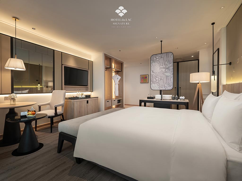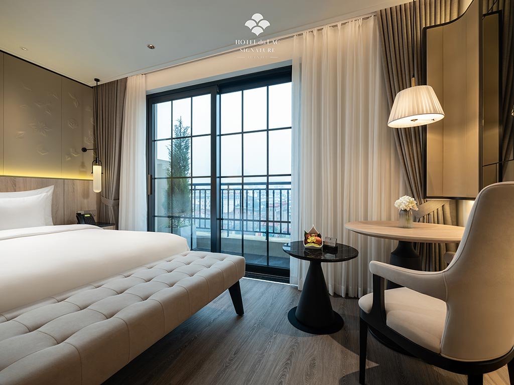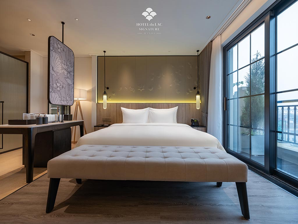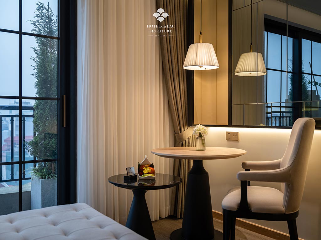 Where contemporary finesse meets the romance of travel, the Heritage Suite City View captures the soul of Hanoi’s legendary train street. Awash in sophisticated neutral tones and adorned with graceful handcrafted details, the suite opens onto a sweeping balcony that frames the captivating passage of trains—an ever-changing scene of motion and charm. Perfect for savoring your morning coffee as the city stirs to life, or for watching twilight embrace the tracks in a golden glow.